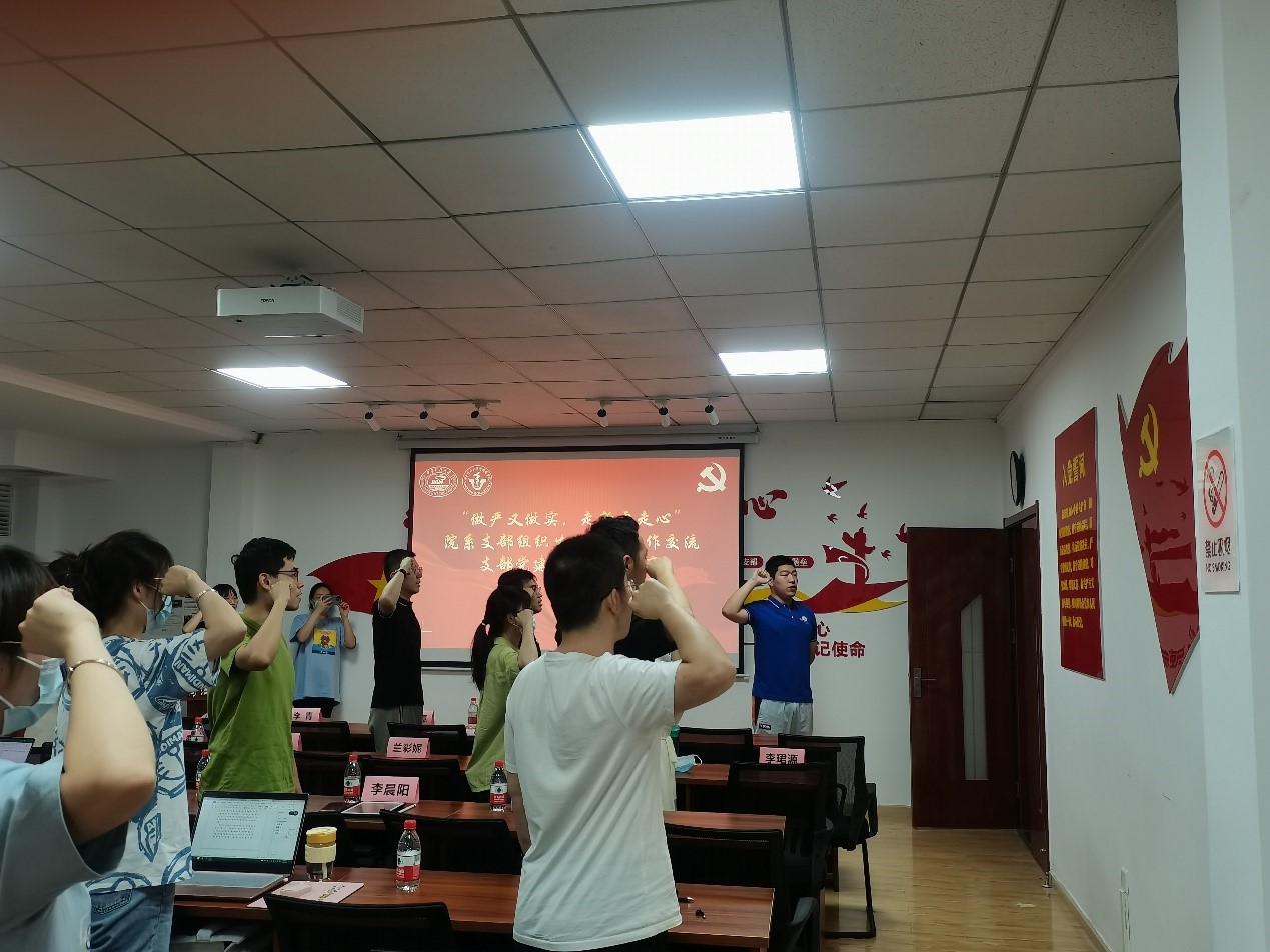 “重温入党誓词”环节,党支部书记代表宋浩阳同志带领全体毕业生党员重温入党誓词,全体党员佩戴党徽,庄严宣誓对党的忠诚和永远跟党走的坚定决心。毕业生党员再一次回顾自己入党时的情景,进一步坚定了自己的理想信念。党员同志们纷纷表示,要积极发挥党员先锋模范作用,在自己的新阶段的岗位上发光发热。