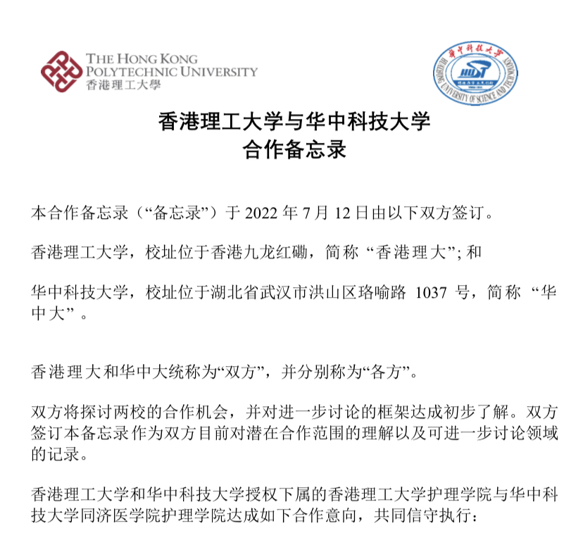 2022年7月12日,护理学院院长毛靖教授与香港理工大学护理学院院长莫礼士教授成功签署合作备忘录,旨在巩固既有友好合作伙伴关系,促进双方护理学科领域的合作与交流,推动两地护理教育事业优势互补、协同发展。